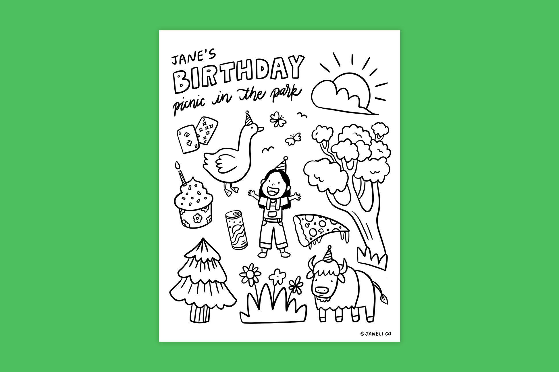 Celebrate your special occasions with a personalized touch using a Custom Coloring Sheet. Whether it's a birthday picnic, a girls' night in, or any memorable event, this unique piece of artwork will add a personal touch to your event that doubles as a party favor!