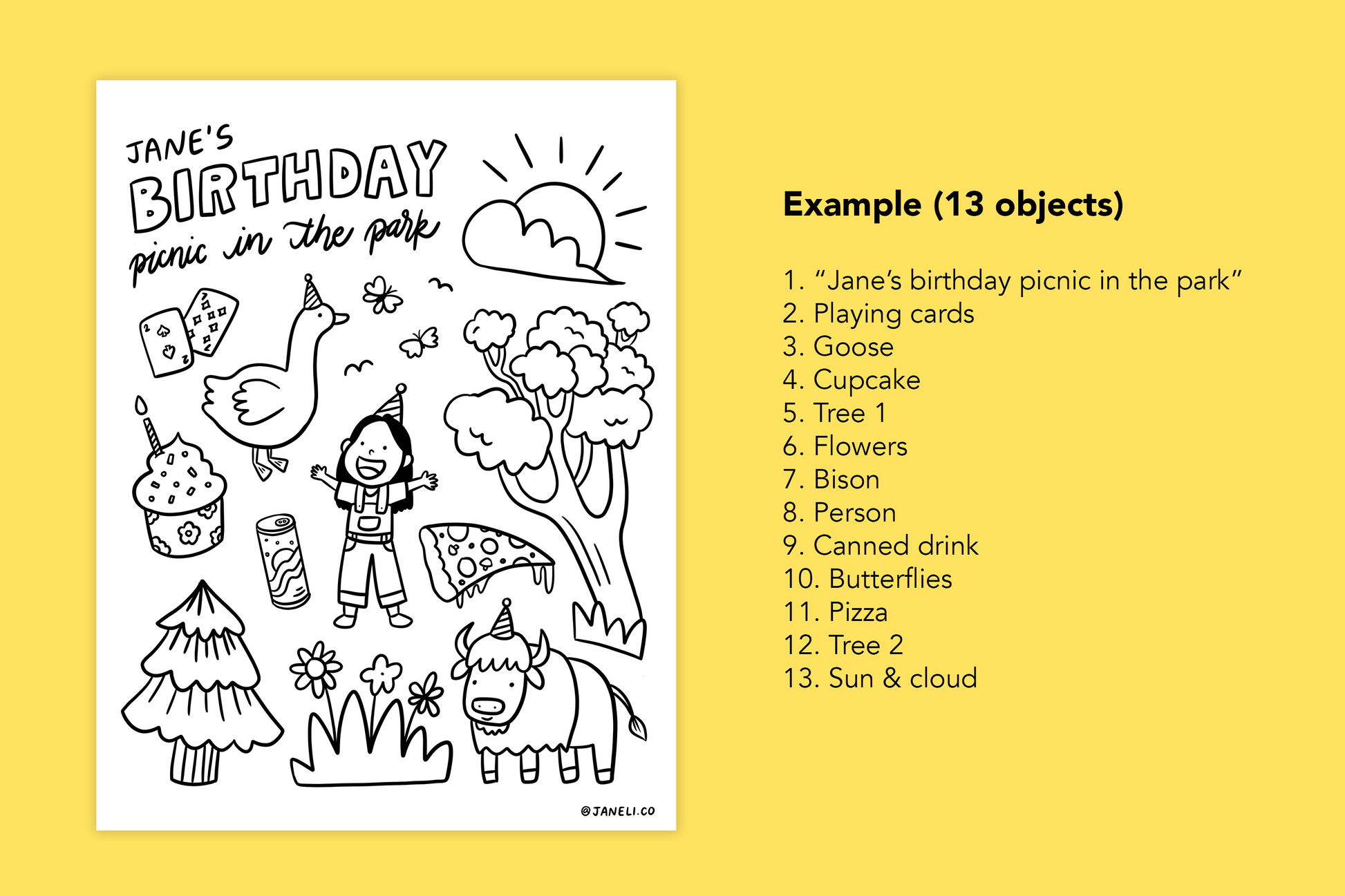 Each Custom Coloring Sheet includes 10 illustrated objects. If you would like additional objects, please select 11-15 in the “Number of Objects” option (there is an additional fee). Maximum number of objects is 15.