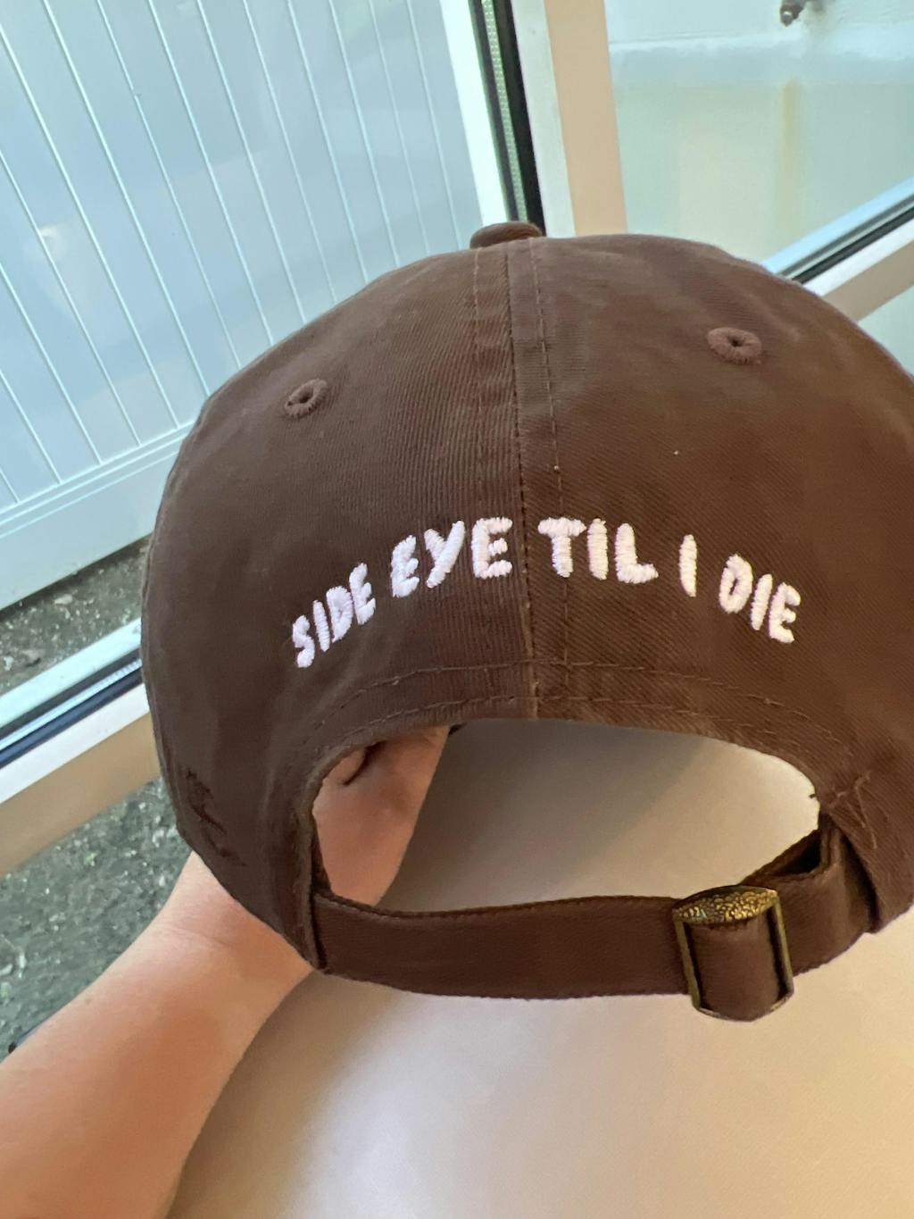 You're not judgemental. You just give great side eye โ bombastic side eye. Show your attitude with this embroidered hat of an adorable dog giving side eye on the front and "Side Eye Til I Die" on the back. These chocolate brown baseball caps are designed for a relaxed fit, complete with curved bill and adjustable buckle strap.